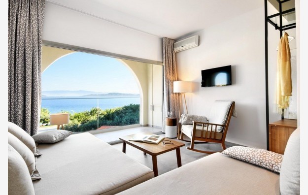 Executive Suite Sea View-oko 40m2 sa pogledom na more. Sastoji se od odvojene spavaće sobe sa francuskim krevetom, dnevnim boravkom sa dve sofe na razvlačenje i dva kupatila. Namenjene za 3 do 4 osobe.