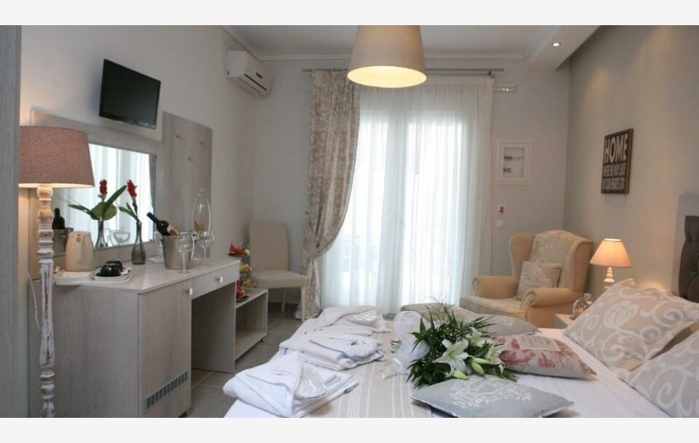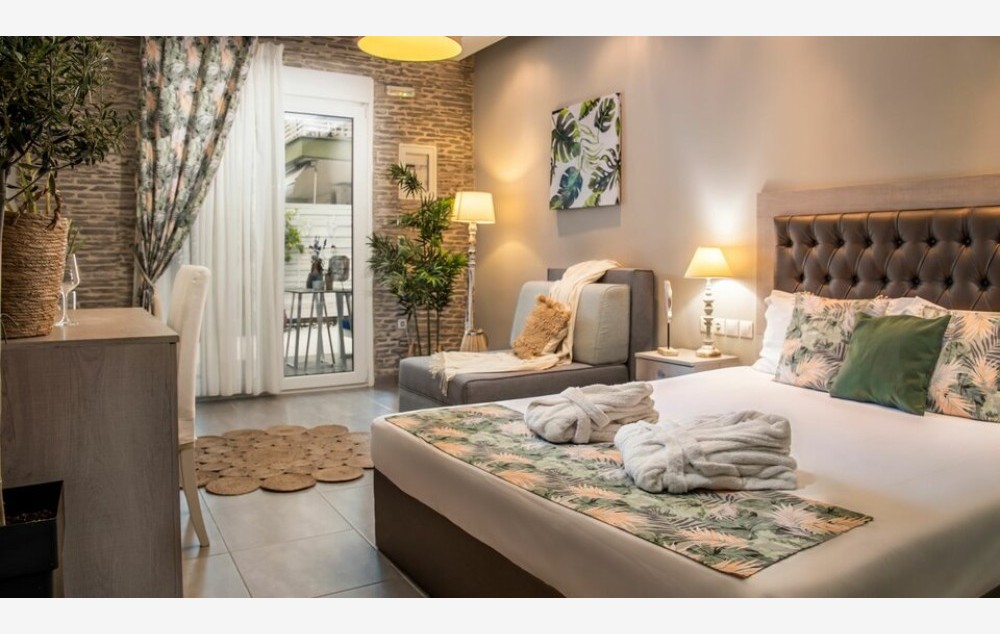 Junior Suite Garden View-Junior Suite od 35 m² ima privatnu baštu, gde su naši cenjeni gosti dobrodošli da se opuste. Uživajte u besplatnom voću i vinu po dolasku i maksimalno iskoristite svoj boravak na Halkidikiju!