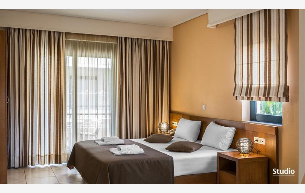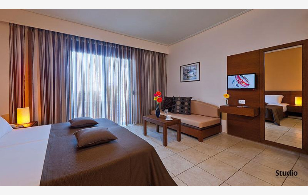 Sadrži ukupno 143 komforne sobe koje mogu biti locirane u prizemlju, na prvom ili drugom spratu. Našim putnicima su na raspolaganju sobe tipa studio i apartman. Mogu biti sa pogledom na bazen ili baštu. Studiji su kapaciteta maksimum dvoje odraslih, dete i beba, ili tri odrasle osobe i beba, sadrže francuski ležaj ili dva standardna ležaja, kao i dodatni ležaj za potrebe treće, a koji može biti pomoćni. U apartman mogu da se smeste do četiri odrasle osobe i beba, tri odrasle osobe, jedno dete i beba ili dve odrasle osobe, dvoje dece i beba. Raspoređeni su duž celog kompleksa, lepo su dekorisani, pružaju udoban smeštaj i sadrže: bračni ili dva standardna ležaja, a za potrebe treće ili četvrte osobe ili deteta pomoćne ležajeve u vidu sofe. Oba sobe tipa studio i apartman su po svojoj osnovnoj strukturi dvokrevetne, dok ostali ležajevi mogu biti pomoćni. Sve sobe sadrže: kupatilo sa kadom ili tuš kabinom, balkon ili terasu, individualni klima uređaj (uključeno u cenu), Sat TV, fen, mini kuhinju, set za kafu/čaj, mini frižider, sef (uz doplatu), Wi-Fi (uključeno u cenu). Bebi krevetac je na usluzi gostima besplatno – obavezna najava prilikom rezervacije.