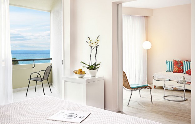 Ivory Junior Suite- 34 m², šik i prostran apartman otvorenog tipa s bračnim krevetom i sopstvenim kupatilom s tušem i samostojećom kadom, smešten na gornjim spratovima glavne zgrade, s prekrasnim bočnim pogledom na more s nameštenog balkona.