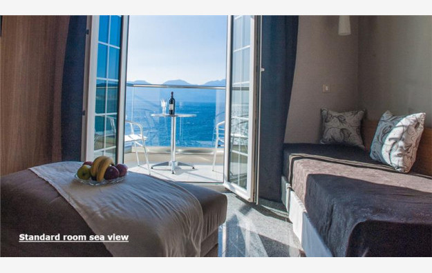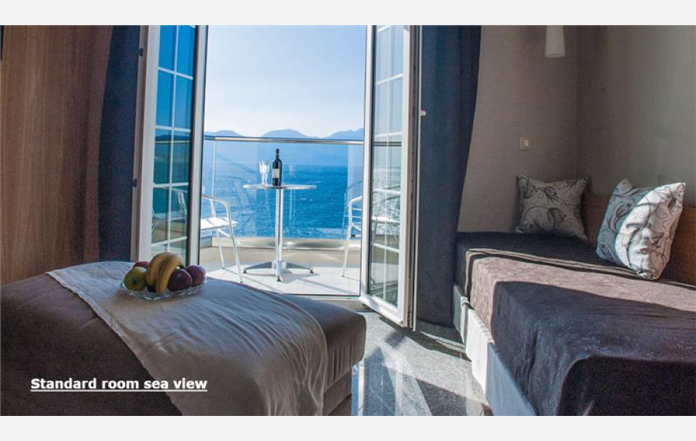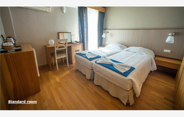 Hotel ima kapacitet od 47 soba koje su elegantno uređene i prostrane, sa pogledom na more ili kopno, dvokrevetne su po svojoj osnovnoj strukturi, dok ostali ležajevi mogu biti pomoćni. Sobe pogled kopno i pogled more su maksimalnog kapaciteta tri osobe imaju francuski ležaj ili dva standardna ležaja kao i dodatni ležaj za potrebe treće osobe koji može biti pomoćni, dok sobe pogled more mogu da prime maksimalno dve osobe i imaju francuski ležaj ili dva standardna ležaja. Sve sobe sadrže TV, mini bar, klima uređaj (besplatno), kupatilo, aparat za kafu/čaj, besplatan sef i besplatan Wi Fi internet. Krevetac za bebu je dostupan na upit, bez doplate.