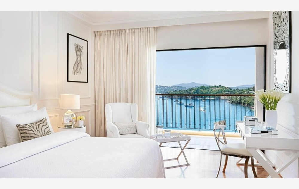 Imperial Suite Sea View-96 m2, Ovaj prostrani i elegantni ugaoni apartman nudi prekrasan panoramski pogled na zaliv Komeno, otvoreno more i treperave slike Starog grada Krfa u daljini, sa bračnim krevetom u glavnoj spavaćoj sobi i krevetom za jednu osobu u dnevnoj sobi. soba.