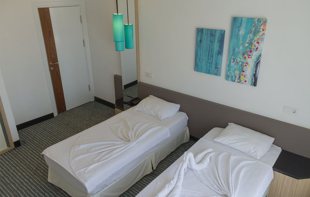 Sobe: standardne sobe dvokrevetne za maksimalno četiri osobe, opremljene sa dva standardna ležaja ili francuskim ležajem i jednim ili dva pomoćna ležaja od kojih jedan može biti i sofa na razvlačenje. Sobe poseduju kupatilo (Tuš WC i fen za sušenje kose), klima uređaj, telefon, TV, mini bar.