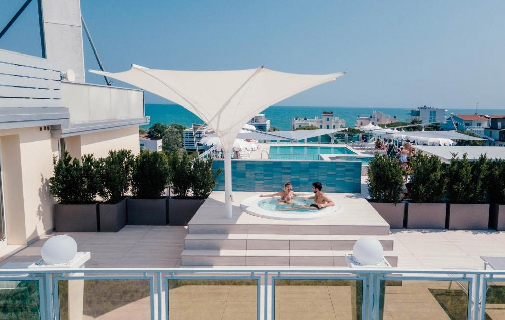 Sadržaj hotela: Recepcija,restoran, lift ,hotelski deo plaže, bazen ,bar parking (po raspoloživosti), terasa za sunčanje, bazen za decu (u kom se voda greje). Hotel ima i wellness centar čije se koriščenje placa 25 eur. Ležaljke na bazenu je moguće rezervisati na recepciji hotela, uz doplatu.