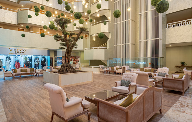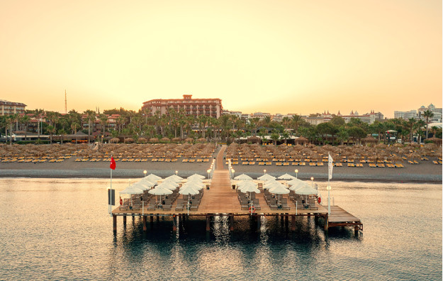 Hotelski sadržaj: Recepcija, 2 glavna restorana, 2 a la carte restorana, dijetalni meni, 13 barova, 2 unutrašnja i 5 spoljašnjih bazena, 5 dečijih bazena, 6 đakuzija, akva park sa 19 tobogana (10 dečijih), bioskopska sala, dnevne i večernje animacije, mini klub (za decu od 4-12 godina), teenage klub (za decu od 13-17 godina), mini disko, igraonica, aerobic u vodi, bocanje, pikado, stoni tenis, odbojka na pesku, teniski teren, košarka, tursko veče, hamam, sauna, parna soba, teretana, bilijar (uz doplatu), wi fi (u lobiju).