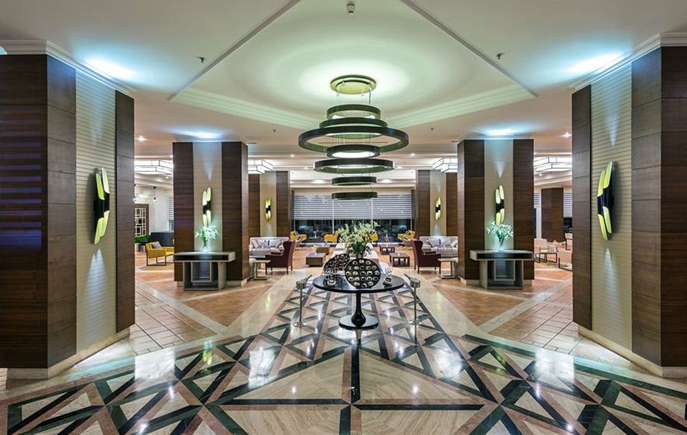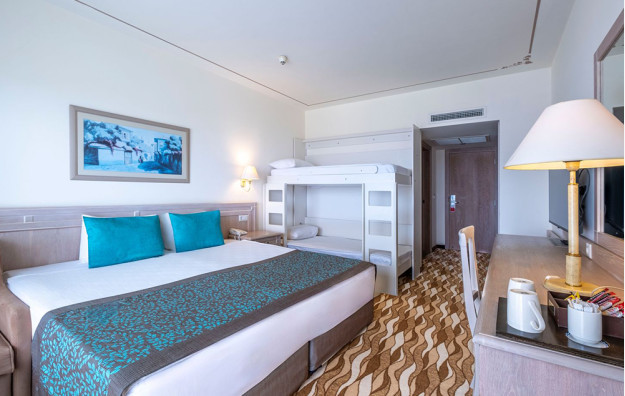 Hotelski sadržaj: Recepcija, 2 glavna restorana, 2 a la carte restorana, dijetalni meni, 13 barova, 2 unutrašnja i 5 spoljašnjih bazena, 5 dečijih bazena, 6 đakuzija, akva park sa 19 tobogana (10 dečijih), bioskopska sala, dnevne i večernje animacije, mini klub (za decu od 4-12 godina), teenage klub (za decu od 13-17 godina), mini disko, igraonica, aerobic u vodi, bocanje, pikado, stoni tenis, odbojka na pesku, teniski teren, košarka, tursko veče, hamam, sauna, parna soba, teretana, bilijar (uz doplatu), wi fi (u lobiju).