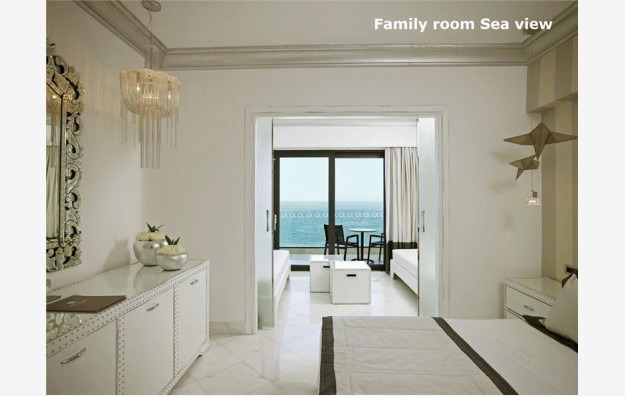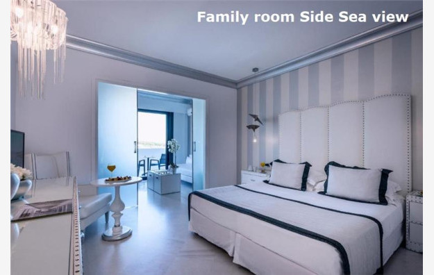 Porodične sobe pogled more površine oko 37m², sastoje se od dve prostorije odvojene kliznim vratima, namenjene za smeštaj 2-4 osobe, sadrže, francuski ili dva standardna ležaja i dva sofa ležaja. Sve sobe su po svojoj osnovnoj strukturi dvokrevetne, dok ostali ležajevi mogu biti pomoćni. Hotel ima u ponudi sobe prilagođene osobama sa invaliditetom (na upit).Bebi krevetac je na raspolaganju gostima besplatno (obavezna najava prilikom rezervacije).