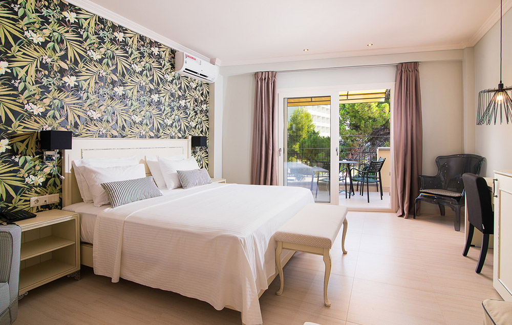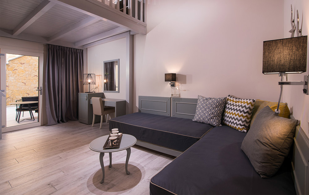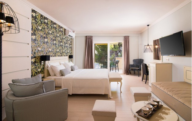 Deluxe Suite- 33 m2, redefinišući porodično vreme, ovi apartmani imaju spavaću sobu otvorenog plana sa bračnim krevetom i 2 singl sofa za decu, namešteni balkon sa pogledom na okolinu i bazen i sopstveno kupatilo sa tušem.