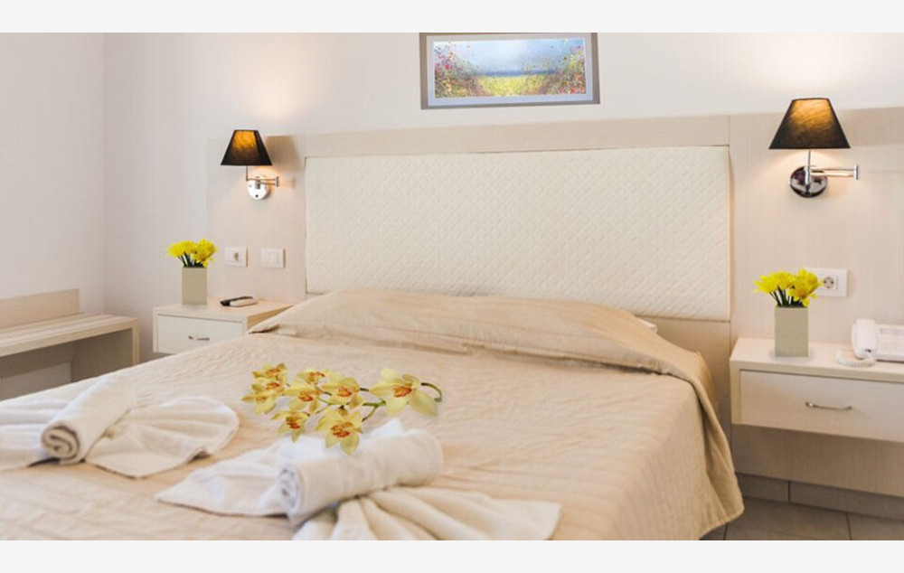 Junior Suite Garden View-Prostrani deluks i sveže uređeni sa bračnim krevetom i sofom za sedenje, gde može da se smesti i 3. osoba. Svi junior apartmani imaju set za vodu, ogrtač i krevete za spavanje.