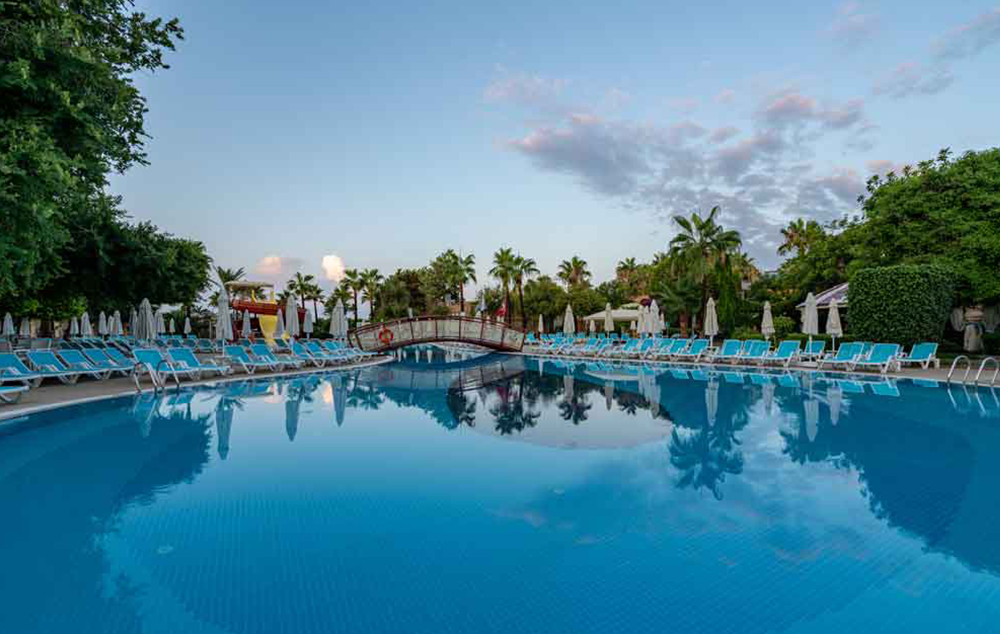 Hotelski sadržaj: Recepcija, 2 glavna restorana, 2 a la carte restorana, dijetalni meni, 13 barova, 2 unutrašnja i 5 spoljašnjih bazena, 5 dečijih bazena, 6 đakuzija, akva park sa 19 tobogana (10 dečijih), bioskopska sala, dnevne i večernje animacije, mini klub (za decu od 4-12 godina), teenage klub (za decu od 13-17 godina), mini disko, igraonica, aerobic u vodi, bocanje, pikado, stoni tenis, odbojka na pesku, teniski teren, košarka, tursko veče, hamam, sauna, parna soba, teretana, bilijar (uz doplatu), wi fi (u lobiju).