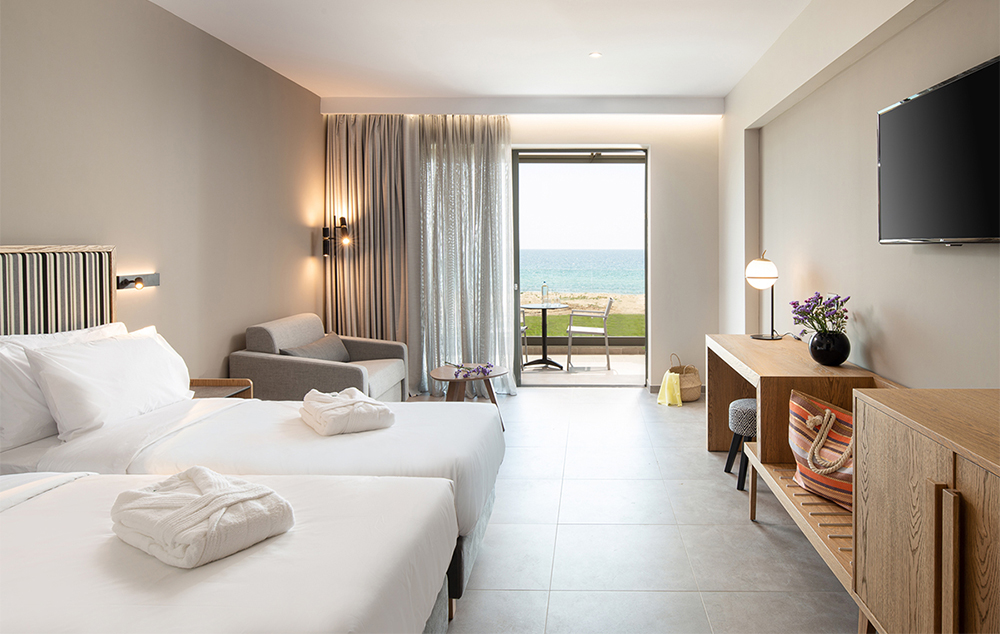 Superior Room Sea Front-30 m2, open space dvokrevetna soba sa sofom na razvlačenje, ima pogled na more, nalazi se u zgradama ispred mora, najbliže plaži.