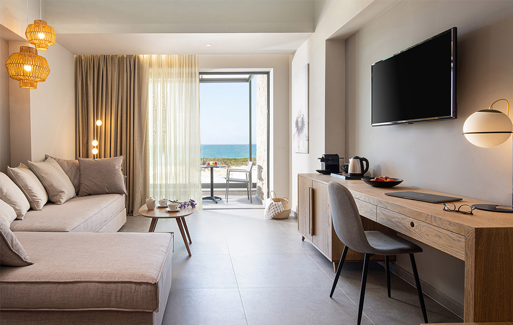 Junior Suite Sea Front-35 m2, kombinovani dnevni boravak i spavaća soba, sa francuskim ili dva odvojena kreveta i sofom na razvlačenje.
