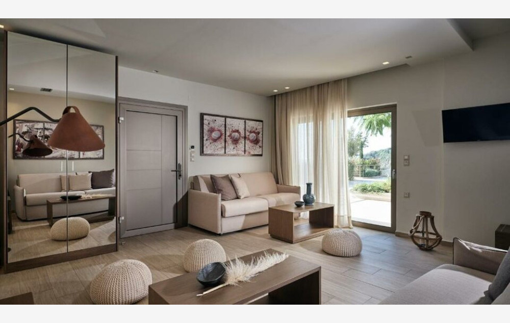 Deluxe Suite with Side Sea View - 35-40 m2, udoban apartman s odvojenom spavaćom sobom s bračnim krevetom i dnevnim boravkom s kaučem na razvlačenje, sopstvenim kupatilom sa tušem i nameštenim balkonom s bočnim pogledom na Jonsko more.
