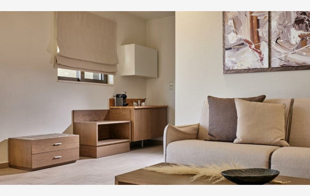 Grand Suite Side Sea View - Elegantno namešten veliki apartman od 59 m² s prostranim dnevnim boravkom s 2 kauča na razvlačenje, udobnom spavaćom sobom s bračnim krevetom i modernism kupatilom sa tušem, kao i privatnom nameštenom verandom s pogledom na vrt i more.