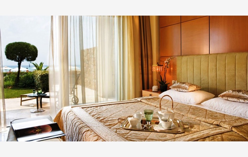 Deluxe Suite Beachfront-Elegantno uređen, sastoji se od dnevnog boravka, spavaće sobe sa odvojenim garderoberom, dva kupatila i privatnog vrta koji nudi savremeni dizajn i udobnost. Prozori od poda do plafona u dnevnoj sobi i spavaćoj sobi gledaju na veličanstveno Egejsko more. Kreveti Dream opremljeni luksuznim dušecima za dodatnu udobnost, luksuzna posteljina i izbor jastuka, međunarodni telefon sa direktnim biranjem, DVD/CD plejer, 2 višekanalna satelitska televizora sa ravnim ekranom i integrisani muzički kanali, BOSE priključna stanica za iPod (dostupan je unapred instaliran iPod na recepciji), fen za kosu, mini bar, elektronski sef (besplatno), pribor za pripremu kafe i čaja, Nespresso aparat, klima / grejanje (pojedinačno podesivo po sobi), besplatan vi-fi. Mermerno kupatilo sa kadom, ogledalo za šminkanje, dva umivaonika i dodatno kupatilo za goste sa tušem. Luksuzni toaletni pribor. Pod od pločica ili mermera sa tepihom. Terasa sa privatnom baštom (100m2) i nameštaj od ratana uključujući dve ležaljke, sofu, suncobran, dva stolića i dve fotelje. Deluke suite zatvorenog prostora 90m2.