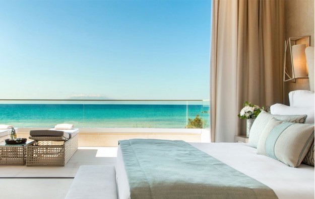 Deluxe Junior Suite Private Garden Beach Front-Velikodušno prostran apartman, koji nudi savremeni dizajn i udobnost. Panoramski prozori pružaju neprekidan pogled na Egejsko more, dok prostrana privatna bašta sa luksuznim nameštajem pruža spokojno okruženje u kojem se možete opustiti i opustiti. Prostrano kupatilo dolazi sa ekskluzivnim priborom Anne Semonin. Terasa sa luksuznim nameštajem, 2 ležaljke, stolić i stolice, pod od pločica, unutrašnji prostor 44m2 / spoljna terasa sa baštom cca. 30m2.