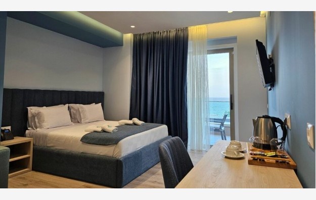 Junior Suite Sea View *- 30 m2, nameštene u bledo zemljanim bojama, imaju odvojenu spavaću sobu sa bračnim ili dva odvojena kreveta i dnevnu sobu sa sofom na razvlačenje, sopstveno kupatilo i nameštenu terasu s pogledom na more.