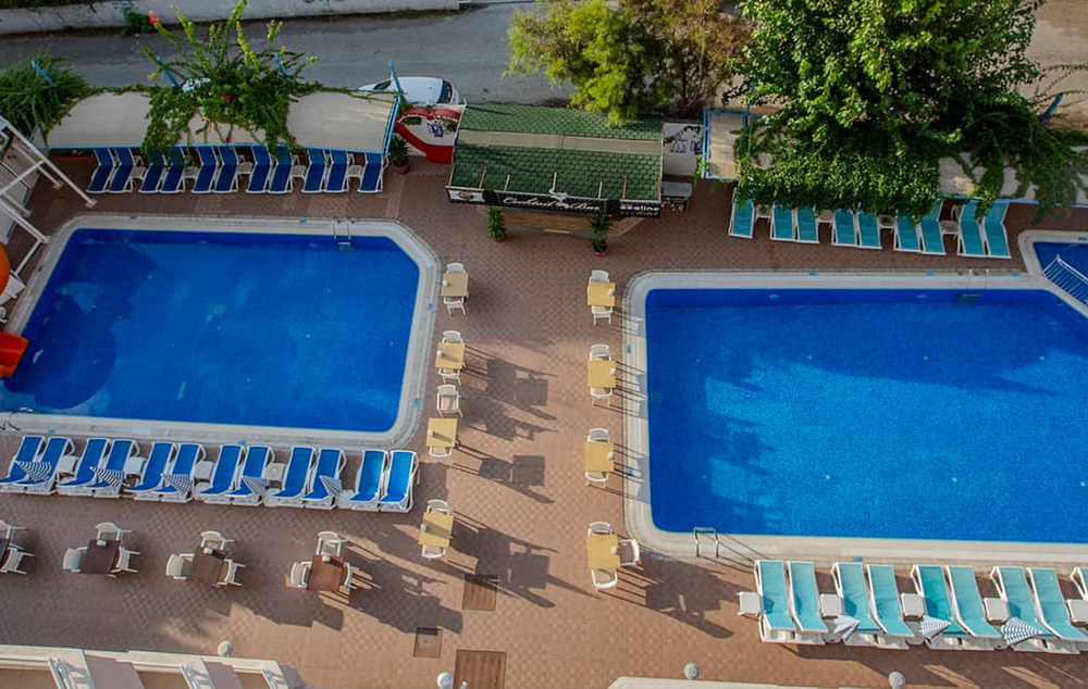 Hotelski sadržaj: Recepcija, lift, 2 restorana, lobby bar, bar pored bazena, dva otvorena bazena sa toboganima i odvojenim delom za decu, frizer, mini market, wi fi beplatno u zajedničkim prostorijama.