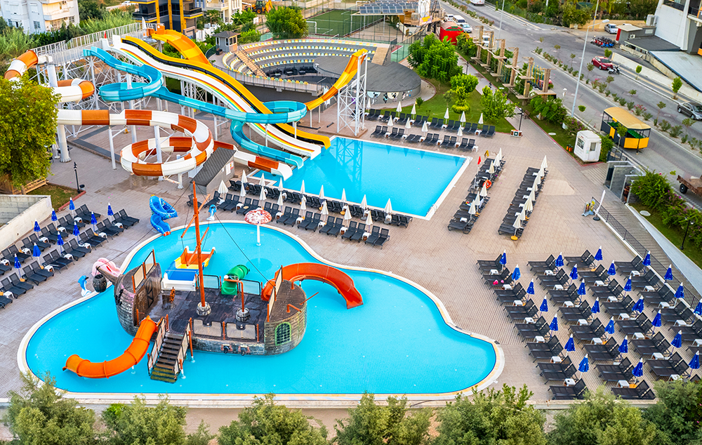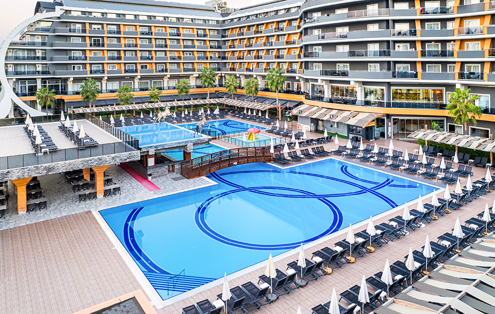 Hotelski sadržaj: Recepcija, glavni restoran, 2 a'la carte restorana, 4 bara, spoljašnje i unutrašnje bazene za decu, kao i bazene sa toboganima za odrasle i decu, amfiteatar, animacije, spa centar, tursko kupatilo, sauna, masaže (uz doplatu), fitnes centar, mini club za decu od 4-13 godina, dečije igralište, game room, bioskop, prodavnice, pikado, teniski tereni.