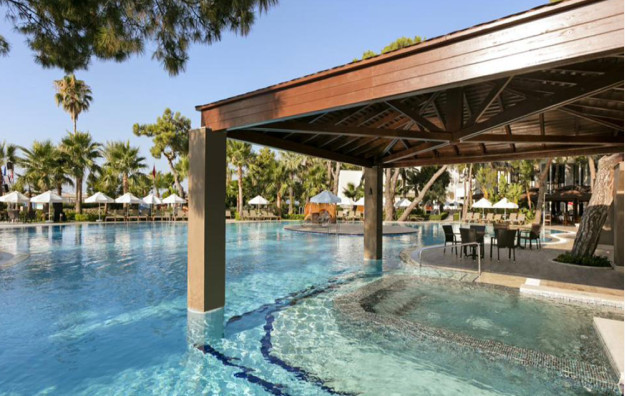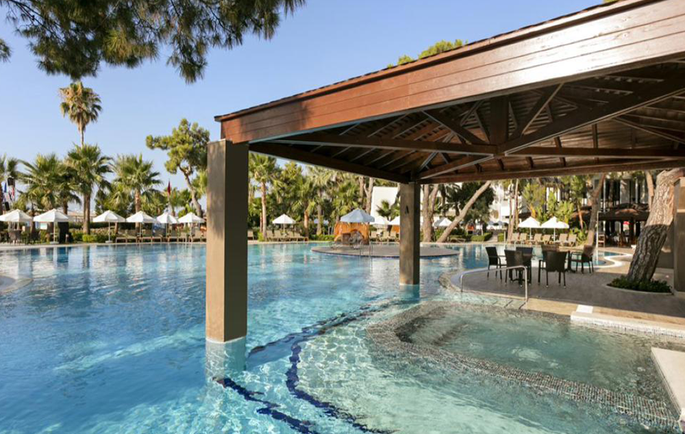 Hotelski sadržaj: Recepcija, 2 glavna restorana, 2 a la carte restorana, dijetalni meni, 13 barova, 2 unutrašnja i 5 spoljašnjih bazena, 5 dečijih bazena, 6 đakuzija, akva park sa 19 tobogana (10 dečijih), bioskopska sala, dnevne i večernje animacije, mini klub (za decu od 4-12 godina), teenage klub (za decu od 13-17 godina), mini disko, igraonica, aerobic u vodi, bocanje, pikado, stoni tenis, odbojka na pesku, teniski teren, košarka, tursko veče, hamam, sauna, parna soba, teretana, bilijar (uz doplatu), wi fi (u lobiju).