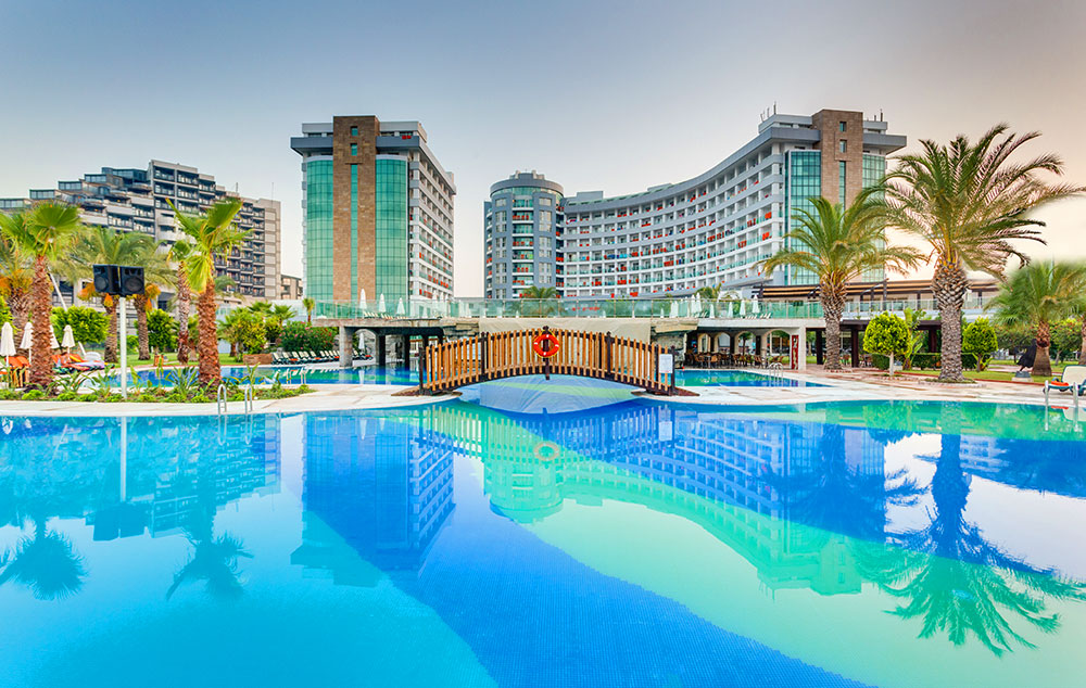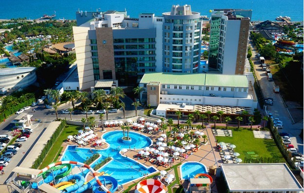 Hotelski sadržaj: Recepcija, 2 glavna restorana, 2 a la carte restorana, dijetalni meni, 13 barova, 2 unutrašnja i 5 spoljašnjih bazena, 5 dečijih bazena, 6 đakuzija, akva park sa 19 tobogana (10 dečijih), bioskopska sala, dnevne i večernje animacije, mini klub (za decu od 4-12 godina), teenage klub (za decu od 13-17 godina), mini disko, igraonica, aerobic u vodi, bocanje, pikado, stoni tenis, odbojka na pesku, teniski teren, košarka, tursko veče, hamam, sauna, parna soba, teretana, bilijar (uz doplatu), wi fi (u lobiju).
