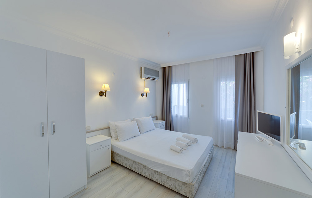 Sobe: Hotel ima 58 soba, raspoređenih u glavnoj zgradi i u 5 blokova. Standard sobe sa pogledom na kopno su veličine oko 16m², sa kupatilom (Tuš WC i fen za sušenje kose), TV, klima uredjaj, telefon, wifi. Ove sobe nemaju balkon. Standard sobe sa pogledom na bazen su površine oko 18m² i isto su opremljene kao sobe sa pogledom na kopno. Ove sobe imaju balkon ili terasu. Maksimlano borave 3 odrasle osobe. Superior sobe su veličine oko 21m², istog su sadržaja kao i standardne sobe, samo što imaju još balkon ili terasu, ketler i frižider.. Maksimalno borave 2 odrasle osobe.