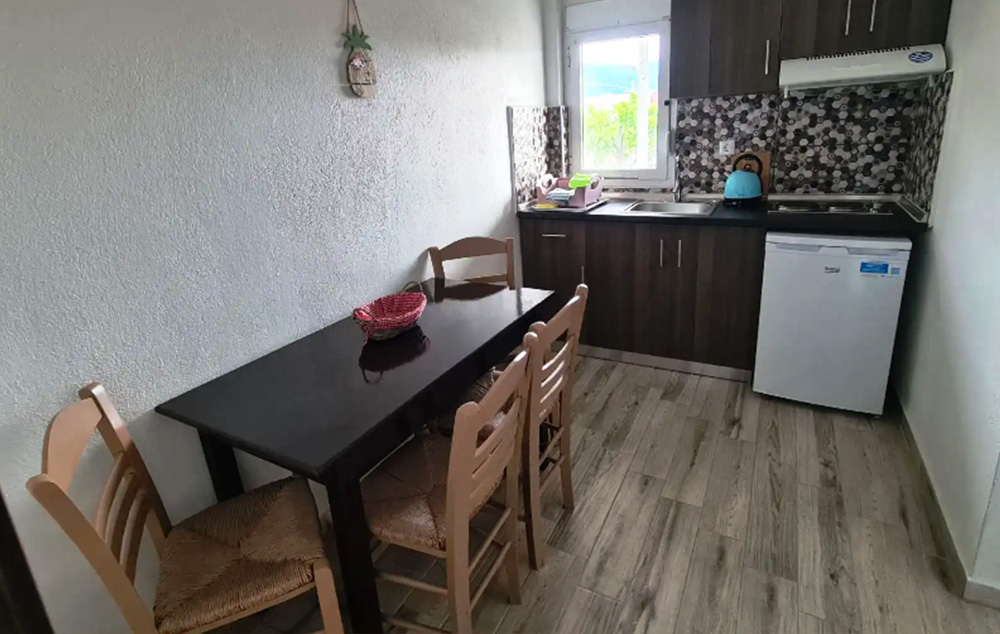 Opis: Vila raspolaže dvokrevetnim, trokrevetnim i četvorokrevetnim moderno opremljenim studijima smeštenim na visokom prizemlju i na prvom spratu. Svaka smeštajna jedinica ima izdvojen kuhinjski deo, ali bez vrata. Svi studiji sadrže opremljenu kuhinju, kupatilo/wc, terasu, TV, WiFi internet i klima uredjaj ( uz doplatu na licu mesta od 6€ po danu ).