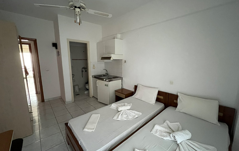 Opis: Smeštajne jedinice u našoj ponudi su dvokrevetni i trokrevetni studiji, nalaze se na prvom i drugom spratu i većina ima pogled na more. Svaki studio poseduje opremljen kuhinjski deo, kupatilo/wc, peškire, terasu, TV, WiFi internet i klima uređaj (uz doplatu na licu mesta od 5€ dnevno). Vila ima prostor za odlaganje prtljaga na dan smene.