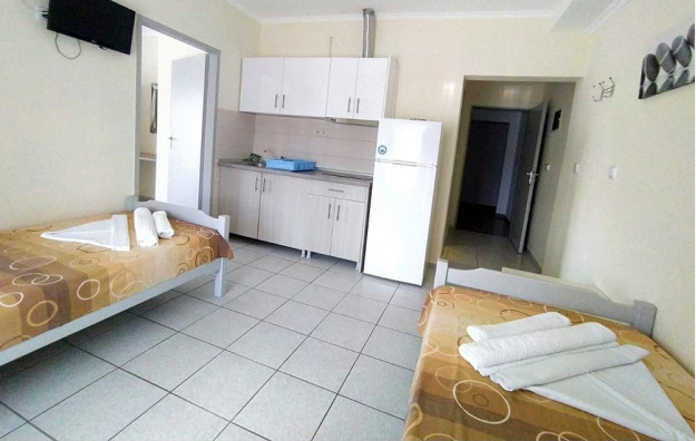 Opis: Smeštajni kapaciteti u našoj ponudi su dvokrevetna, trokrevetna i četvorokrevetna studija, kao i četvorokrevetni i petokrevetni apartmani, koji se nalaze u prizemlju, na prvom i drugom spratu, a svi imaju opremljen kuhinjski deo, kupatilo/wc, terasu, TV, WiFi internet i klima uređaj (uz doplatu na licu mesta od 6€ dnevno).
