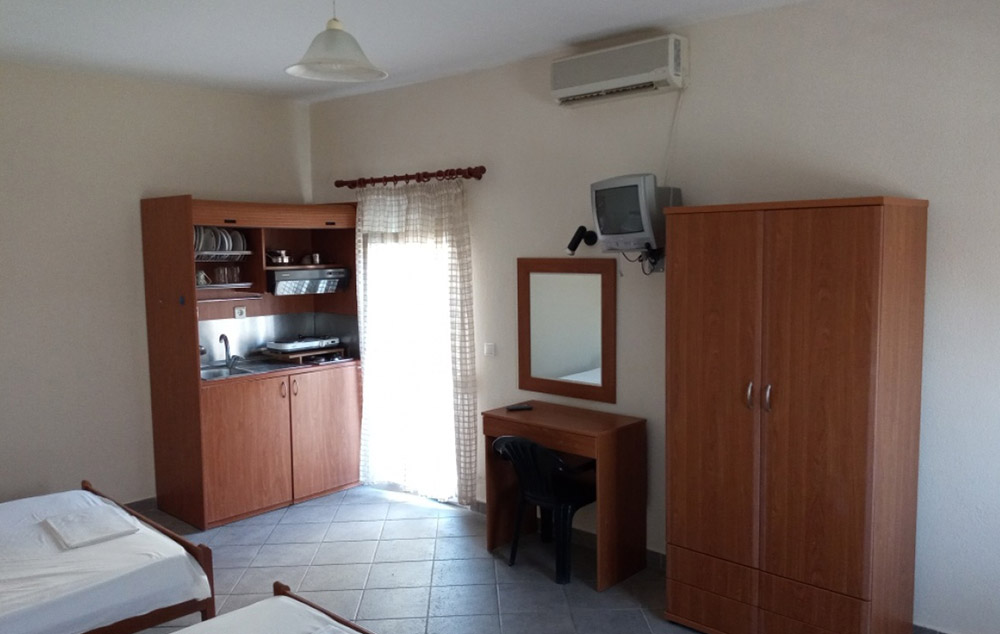 Opis: Nalazi se na glavnom putu kroz Nea Vrasnu, a preko puta velikih super marketa. Poseduje dvokrevetne, trokrevetne, četvorokrevetne i petokrevetne studije, kao i četvorokrevetne i petokrevetne apartmane koji se nalaze u prizemlju, na prvom spratu ili drugom spratu. Smeštajne jedinice u prizemlju su renovirane. Svaka od njih ima opremljen kuhinjski deo, kupatilo/wc, terasu, TV, WiFi internet i klima uređaj (uz doplatu na licu mesta od 5€ dnevno).