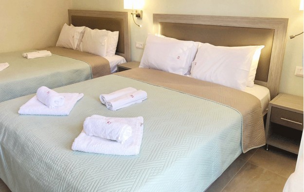 Opis: Smeštajni kapaciteti se nalaze u prizemlju, na prvom ili drugom spratu objekta, a namenjeni su za smeštaj od dve do četiri osobe. Pored standardnih studia, u ponudi su i eko studia koji imaju pogled ka zidu, kao i promo studiji/apartmani koji imaju prolaznu terasu. Određen broj studija/apartmana ima direktni ili bočni pogled na more, a svaki od njih ima kompletno opremljenu kuhinju, kupatilo/wc, terasu ili prostor za sedenje, TV, WiFi internet I klima uređaj (uz doplatu na licu mesta od 6€ dnevno).