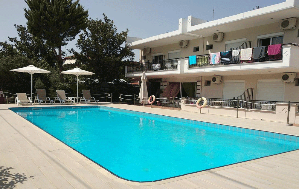 Opis: Apart/hotel Maria raspolaže trokrevetnim i četvorokrevetnim studijima koji se nalaze na prvom i drugom spratu. Smeštajne jedinice su moderno opremljene i imaju kuhinjski deo, TV, kupatilo, terasu i klima uređaj (uračunat u cenu), gledaju na bazen i more. Vila poseduje WiFi, bazen sa odvojenim delom za decu i ležaljkama oko bazena, recepciju.