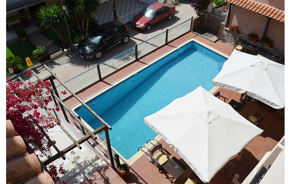 Lokacija: Mali hotel apartmanskog tipa, nalazi se pored crkve, u neposrednoj blizini centra, u mirnom delu Pefkohorija, na oko 190 metara od plaže.