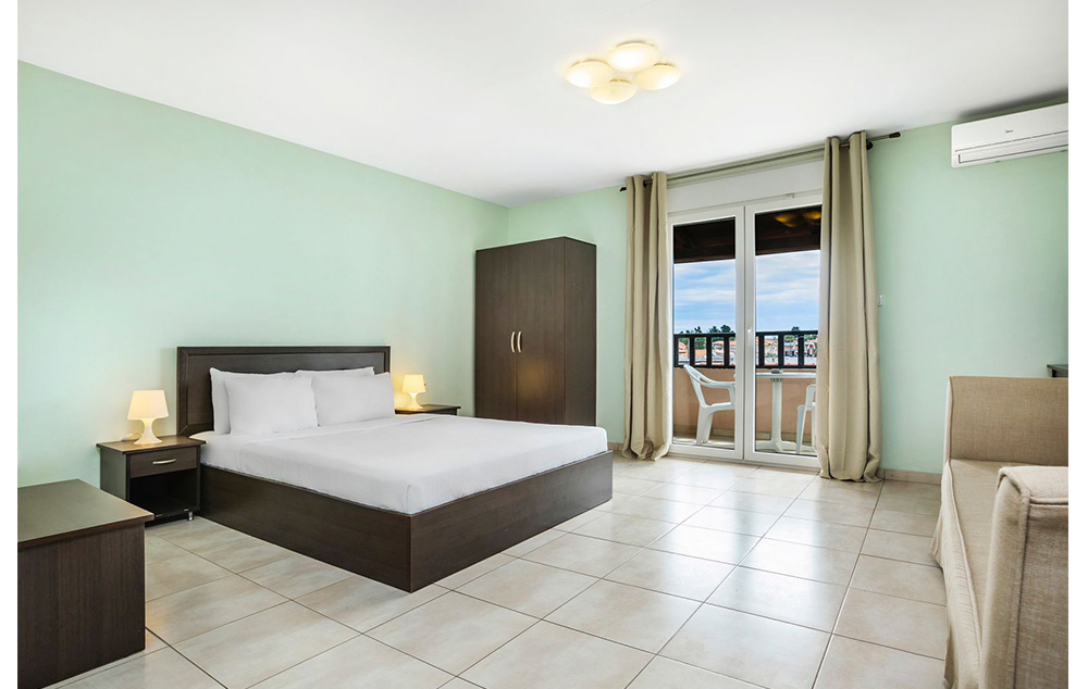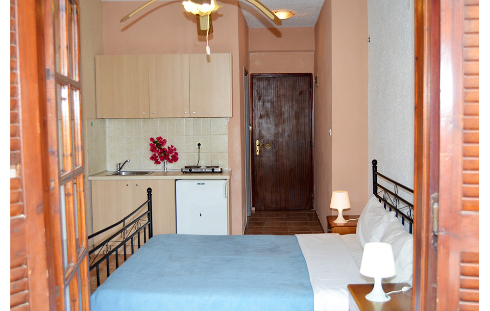 Manji dvokrevetni + 1 studiji (STD 1/2, STD 1/2+1) se nalaze u malo izdignutom prizemlju i na prvom spratu. Lepe i velike terase (sa garniturom za sedenje) gledaju ka vrtu. Studiji su manji, ali funkcionalni i u njima se pored standardnog ležaja, nalazi i prošireni ležaj (francuski ležaj po grčkim standardima-120 cm) na kojem može spavati jedan od roditelja sa detetom. Pored čajne kuhinje sa odgovarajućim posudjem i malim frižiderom (40 l sa komoricom za led) studio je opremljen TV-om, klima uredjajem (uz doplatu na licu mesta (opcija), 5 eur dnevno po studiju), wi – fi Iinternetom, ima malo kupatilo i lepu terasu sa garniturom za sedenje. Ležaljke i suncobrani oko bazena se ne naplaćuju. Studiji su ograničeni na maksimum dve odrasle osobe i dete dodvanaest godina (koje deli prošireni ležaj sa roditeljem). Veličina studija je cca 16 kvm + terasa.