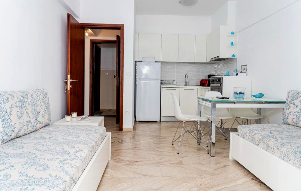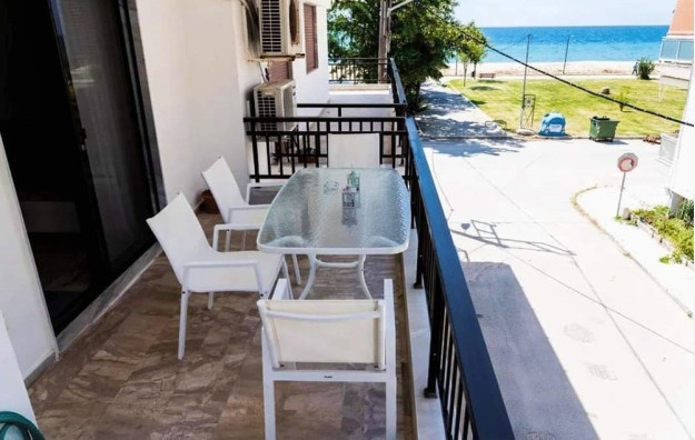 Odlična vila Thalassa Beach, sastoji se od apartmana na prvom spratu i svi su sa bočnim pogledom na more. Pored izuzetnog kvaliteta i opremljenosti ovih apartmana, ističe ih i odlična lokacija, pored same plaže (oko 40 metara) i u strogom centru letovališta, na glavnom šetalištu. Četvorokrevetni apartman sadrži dobro opremljenu kuhinju sa trpezarijskim stolom (veliki frižider sa zamrzivačem, šporet sa rernom, mašina za pranje sudova...), a u nastavku se nalazi deo sa dnevnim boravkom gde se nalaze sofe - dva ležaja nešto manjih dimenzija od standardnih, na kojima mogu spavati deca do 12 godina (ili do 15 na upit), spavaću sobu sa dva standardna ležaja i plafonskim ventilatorom, kupatilo sa kadom i veliku natkrivene terasu sa garniturom za sedenje. Veličina apartmana je cca 35 kvm + terasa. Opremljen je sa wi – fi Internetom, TV-om i mrežom za komarce, klima uredjajem (uključeni u cenu) u dnevnom boravku, dok spavaća soba ima plafonski ventilator. Četvorokrevetni dupleks apartman sadrži dobro opremljenu kuhinju sa trpezarijskim stolom i sofom (veliki frižider sa zamrzivačem, šporet sa rernom...), dve spavaće sobe sa po dva standardna ležaja, kupatila sa kadom i velike natkrivene dve terase sa garniturom za sedenje. Veličina apartmana je cca 40 kvm + terasa. Opremljen je sa wi – fi Internetom, TV-om i mrežom za komarce, dva klima uredjaja (uključeni u cenu), jedan u dnevnom boravku i drugi u spavacoj sobi, dok druga spavaća soba ima plafonski ventilator. Vila Thallasa Beach je A kategorije, ima peškire, a parkiranje je moguće na ulici pored vile.