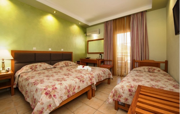 Family room – oko 34m2 prostrana porodična soba otvorenog plana sa jednim bračnim krevetom i jednim kaučem na razvlačenje za 2 dece, nameštenim balkonom sa pogledom na baštu i sopstvenim kupatilom sa tušem. Namenjena za 4 osobe.