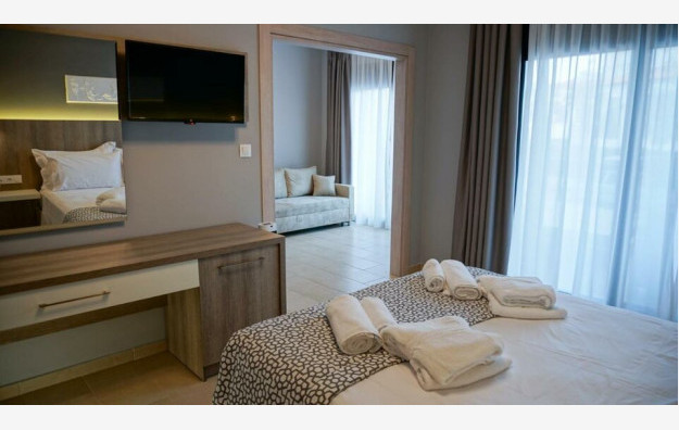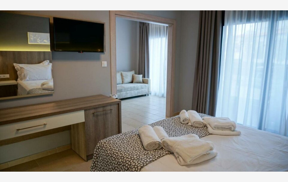 Junior suite - 26 m2, ima otvoreni prostor s bračnim krevetom, kaučem na razvlačenje za dve osobe i kaučem na razvlačenje za jednu osobu, pogodan za 5 osoba