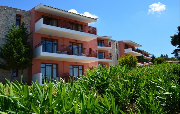 Double Room Sea View – 23 m2, smešten u zgradi najbližoj recepciji, idealne pozicije kako bi pružio najbolji mogući pogled na golf teren Toroneos i selo Pefkohori (namenjen za 2-3 osobe, bračni krevet sa sofom).