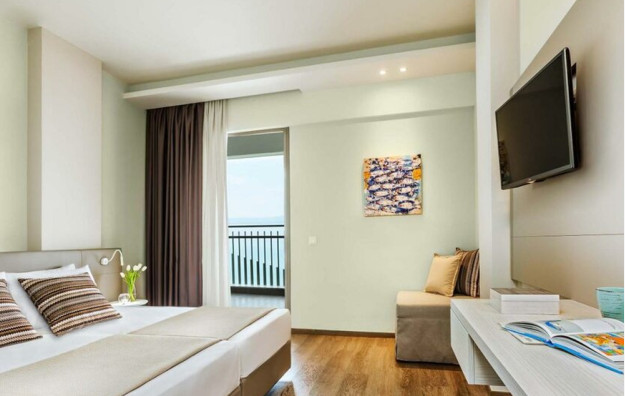 Premium Room Sea Front- Sobe od 21 m² s prekrasnim pogledom na more, bračnim ili dva odvojena kreveta i kaučem na razvlačenje za treću osobu, nameštenim balkonom i sopstvenim kupatilom s tušem.