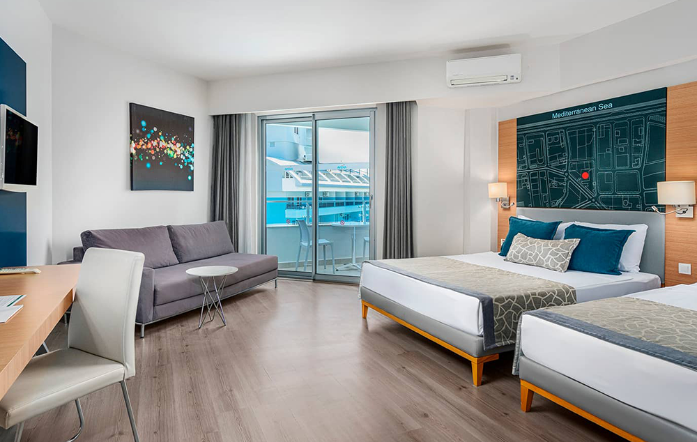 Smeštaj: Hotelski kompleks čine glavna sedmospratna zgrada i pet dvospratnih vila koje imaju ukupno 358 soba. U glavnoj zgradi se nalaze standardne sobe sa pogledom na kopno ili more i porodične sobe, dok se u vilama nalaze vila standardne sobe i vila porodične sobe. Hotel poseduje i sobe za osobe sa posebnim potrebama.