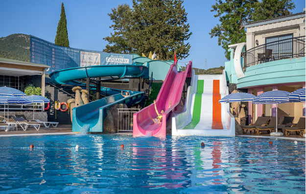 Hotelski sadržaj: Recepcija, glavni restoran, bar pored bazena, bazen za odrasle sa toboganom i odvojenim delom za decu, spa (tursko kupatilo, sauna i masaže-sve uz doplatu).