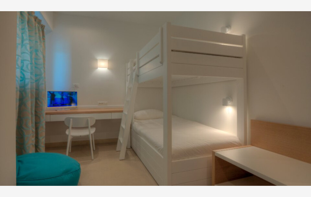 Family Room Bunk Beds Sea View-37 kv.m, moderan sa 2 odvojene spavaće sobe sa kliznim vratima; glavna spavaća soba sa bračnim krevetom i dečija spavaća soba sa dva odvojena kreveta ili krevetima na sprat, 2 satelitska TV i zajedničko kupatilo,pogled na more.