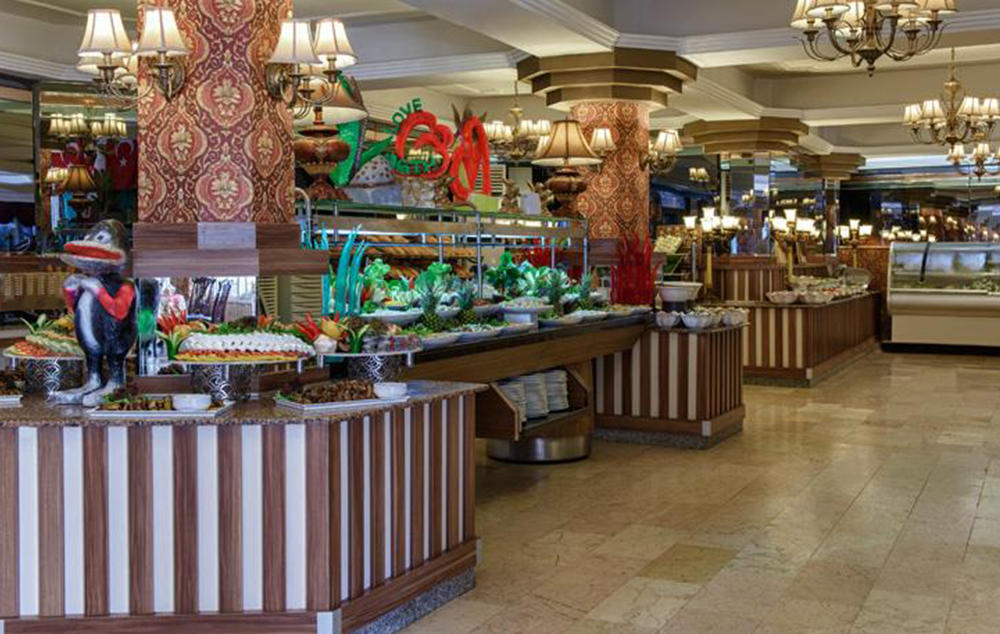 Hotelski sadržaj: Recepcija, glavni restoran, 6 a la carte restorana (riblji, turski i italijanski, japanski, kineski i suši-1 u toku boravka besplatno uz obaveznu rezervaciju), 8 barova, 3 bazena za odrasle, 3 bazena za decu, bazen sa toboganima za decu i odrasle, mini klub (od 4-12 god.), dečija igraonica, dečiji bioskop, mini disko, dečiji luna park, dnevna i večernja animacija za decu i odrasle, tursko kupatilo, sauna, parno kupatilo, masaže (uz doplatu), teretana, odbojka na plaži, stoni tenis, teniski teren, pikado, bilijar, gimnastika, aqua gym, aerobik, wi fi (besplatno u lobiju).