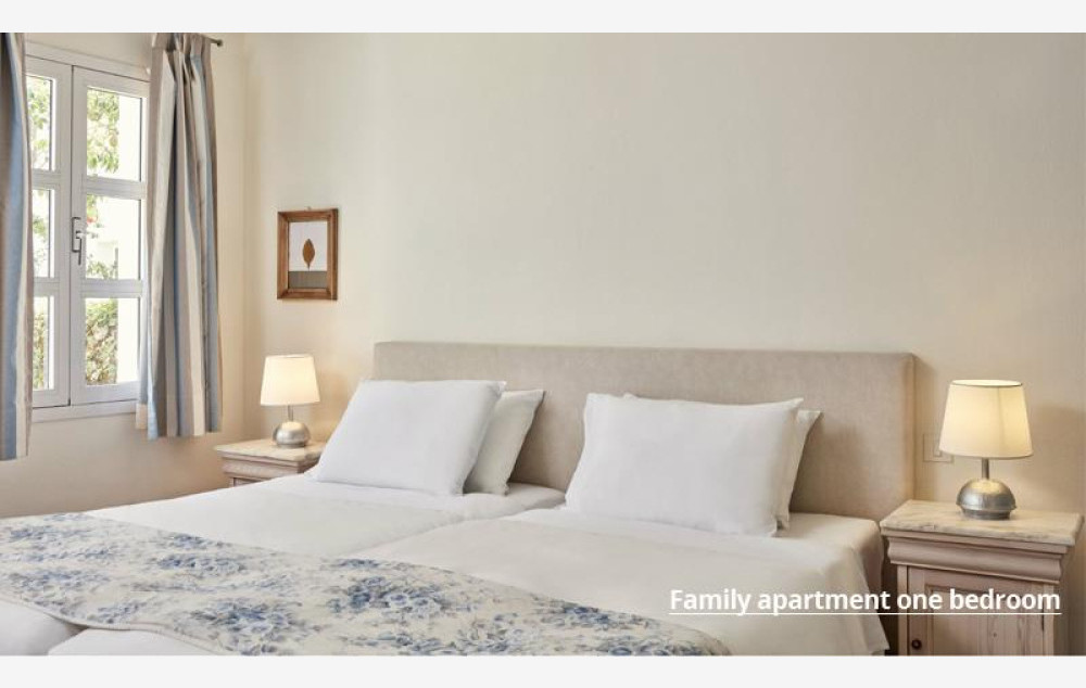 Hotel se sastoji od više manjih zgrada u kojima se nalaze 222 sobe, koje mogu biti udaljene od plaže i do 400 metara, sve sobe su dvokrevetne po svojoj osnovnoj strukturi, dok ostali ležajevi mogu biti pomoćni. "Jednosobni family apartman village view" je kvadrature 40 m2 i sastoji se od spavaće sobe i dnevnog boravka sa trpezarijom i kuhinjom. U kuhinjskom delu se nalaze pomoćni ležajevi predviđeni za spavanje treće ili četvrte osobe, a u spavaćoj sobi dva lezaja koji mogu biti spojeni ili odvojeni. "Jednosobni family apartman with garden" je iste kvadrature kao i jednosobni family apartman village view, sa razlikom što ima izlaz na bašte rizorta. Ljubitelji prirode će obozavati ovaj tip sobe zbog pristupa zelenim povrsinama rizorta. Jednosobni family apartman bočni pogled more je kvadrature 40 m2 i sastoji se od spavaće sobe i dnevnog boravka sa trpezarijom i kuhinjom. U kuhinjskom delu se nalaze pomoćni ležajevi predviđeni za spavanje treće ili četvrte osobe, a u spavaćoj sobi dva lezaja koji mogu biti spojeni ili odvojeni. Jednosobni superior apartman bočni pogled more je kvadrature 60m2 može da primi maksimalno četvoro odraslih i dvoje dece ili troje odraslih i troje dece. Sastoji se od jedne spavaće sobe sa dva odvojena kreveta, dnevnog boravka sa trpezarijskim stolom i četiri kreveta na razvlačenje. Svi tipovi apartmana imaju: klima uređaj, wi-fi internet, direktna telefonska linija, sef, SAT-TV, fen za sušenje kose, kuhinju za pripremanje laganih obroka, frižider, aparat za kafu ili čaj, balkon ili terasu sa garniturom za sedenje.