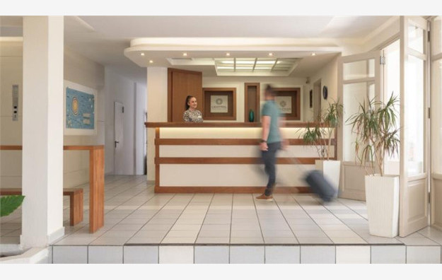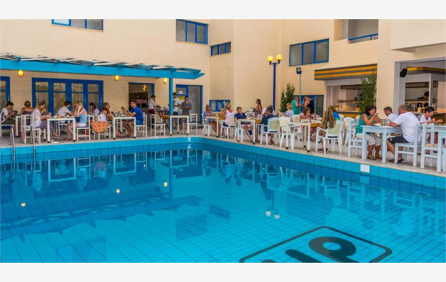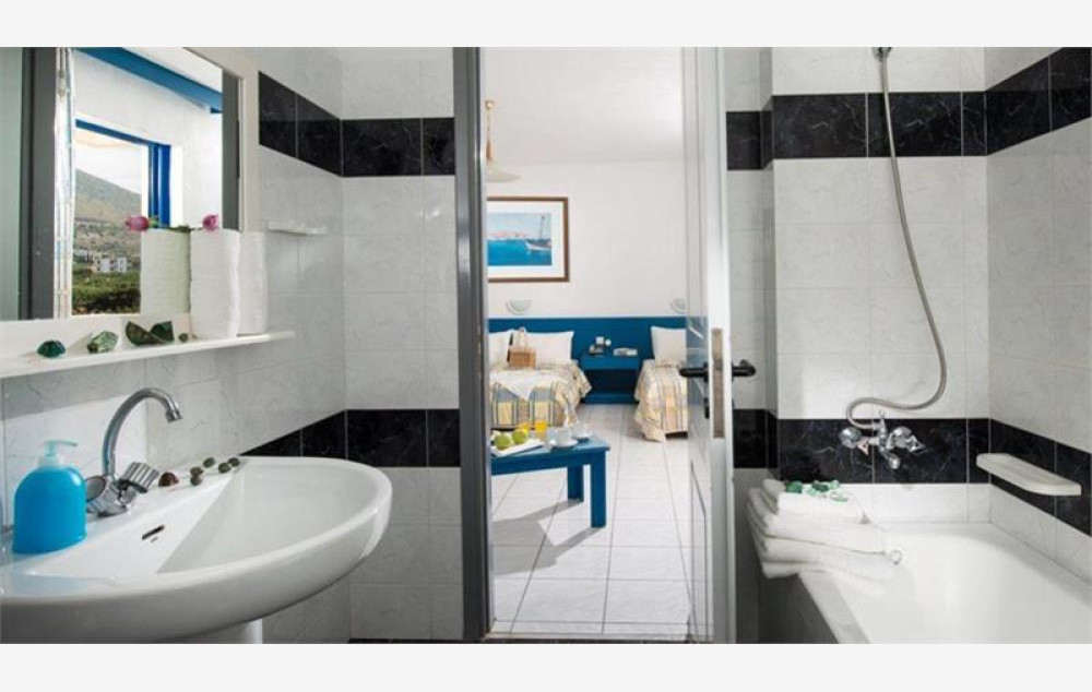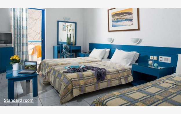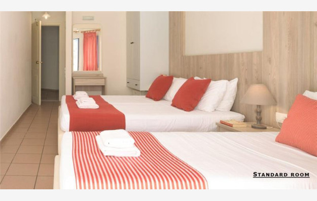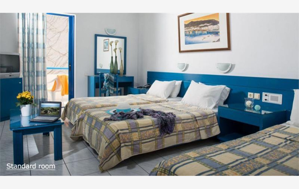 Hotel se sastoji od 90 soba raspoređenih u dve zgrade, glavnu i anex zgradu. Agencija Big Blue svojim putnicima nudi smeštaj u sobama koje se nalaze u glavnoj zgradi u kojoj se nalazi recepcija i ostali sadržaji. Gostima su na raspolaganju sobe tipa standard, kapaciteta maksimum tri osobe i beba, koje sadrže francuski ležaj ili dva standardna ležaja i jedan dodatni ležaj koji može biti standardni ili pomoćni. Sve sobe su po svojoj osnovnoj strukturi dvokrevetne, dok ostali ležajevi mogu biti pomoćni. Sve sobe raspolažu kupatilom (tuš kada ili kada), fenom za kosu, SatTV-om, frižiderom, klima uređajem (besplatno), wi-fi internetom (besplatno) i sefom (uz doplatu na licu mesta, po sobi 2 evra dnevno). Bebi krevetac je na raspolaganju gostima besplatno (obavezna najava prilikom rezervacije).