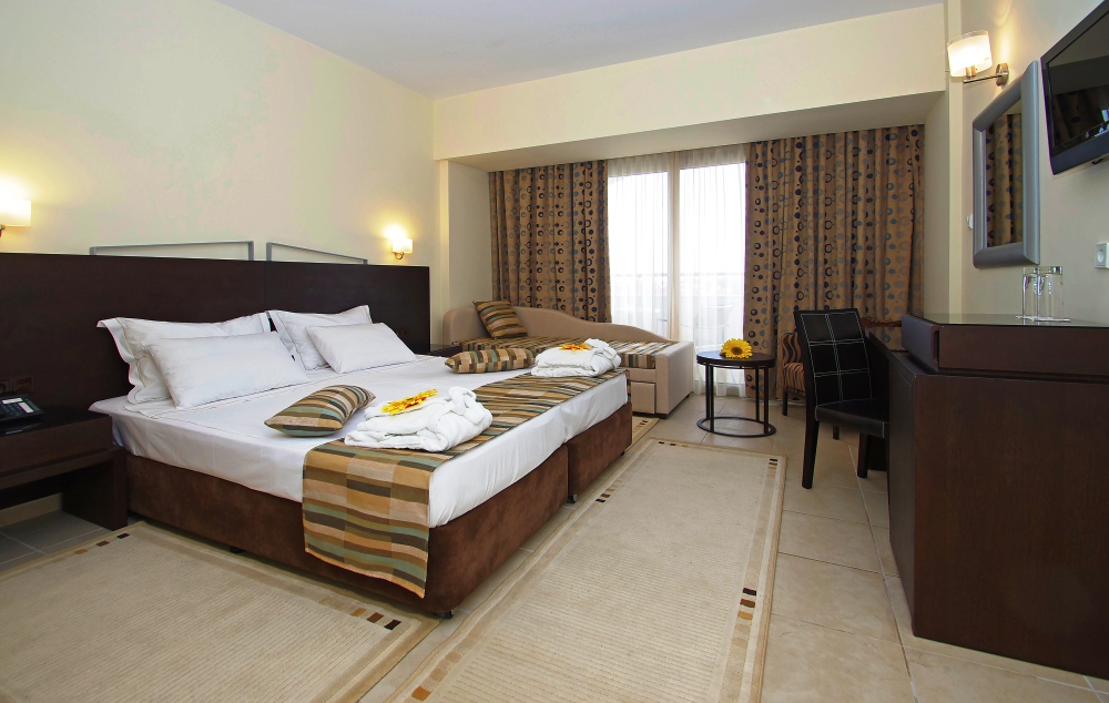 Superior Room Side Sea View- 20-24 m2, idealno za porodice, sastoji se od jednog prostora s bračnim ili dva odvojena kreveta i jednim ili dva kauča na razvlačenje, smešten u glavnoj zgradi, nedavno renoviranoj i smeštenoj na gornjim spratovima, s nameštenim balkonima s bočnim pogledom na more.