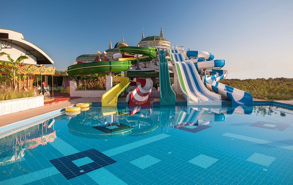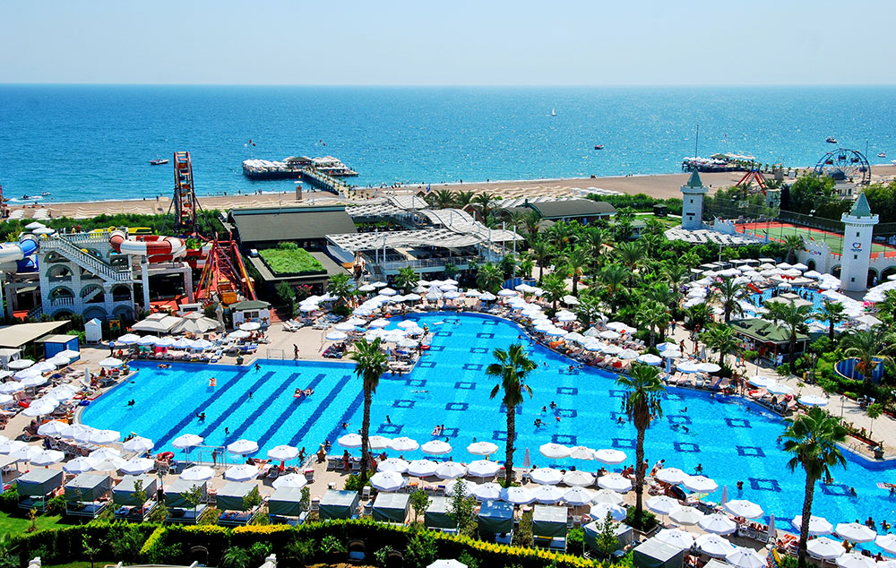 Hotelski sadržaj: Recepcija, 2 glavna restorana, 2 a la carte restorana, dijetalni meni, 13 barova, 2 unutrašnja i 5 spoljašnjih bazena, 5 dečijih bazena, 6 đakuzija, akva park sa 19 tobogana (10 dečijih), bioskopska sala, dnevne i večernje animacije, mini klub (za decu od 4-12 godina), teenage klub (za decu od 13-17 godina), mini disko, igraonica, aerobic u vodi, bocanje, pikado, stoni tenis, odbojka na pesku, teniski teren, košarka, tursko veče, hamam, sauna, parna soba, teretana, bilijar (uz doplatu), wi fi (u lobiju).