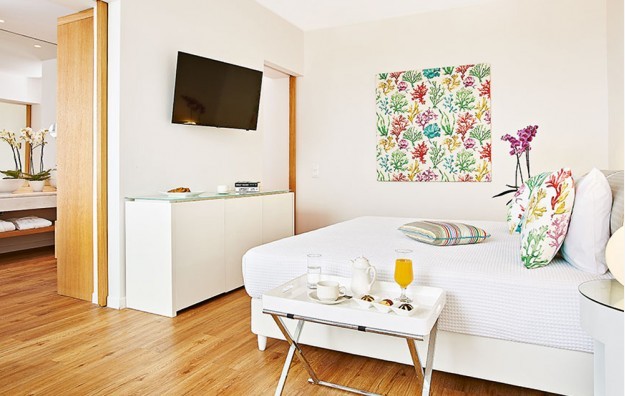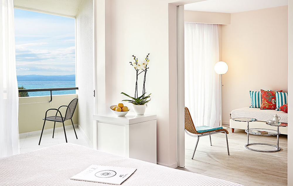 Ivory Junior Suite- 34 m², šik i prostran apartman otvorenog tipa s bračnim krevetom i sopstvenim kupatilom s tušem i samostojećom kadom, smešten na gornjim spratovima glavne zgrade, s prekrasnim bočnim pogledom na more s nameštenog balkona.
