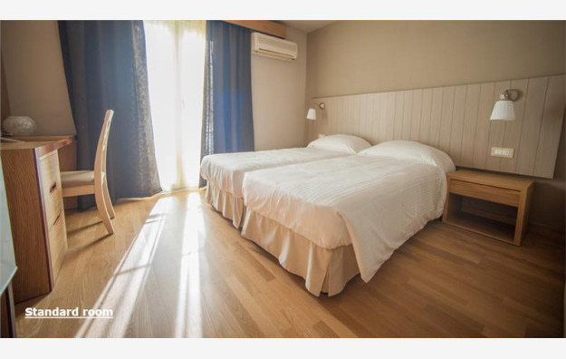 Hotel ima kapacitet od 47 soba koje su elegantno uređene i prostrane, sa pogledom na more ili kopno, dvokrevetne su po svojoj osnovnoj strukturi, dok ostali ležajevi mogu biti pomoćni. Sobe pogled kopno i pogled more su maksimalnog kapaciteta tri osobe imaju francuski ležaj ili dva standardna ležaja kao i dodatni ležaj za potrebe treće osobe koji može biti pomoćni, dok sobe pogled more mogu da prime maksimalno dve osobe i imaju francuski ležaj ili dva standardna ležaja. Sve sobe sadrže TV, mini bar, klima uređaj (besplatno), kupatilo, aparat za kafu/čaj, besplatan sef i besplatan Wi Fi internet. Krevetac za bebu je dostupan na upit, bez doplate.