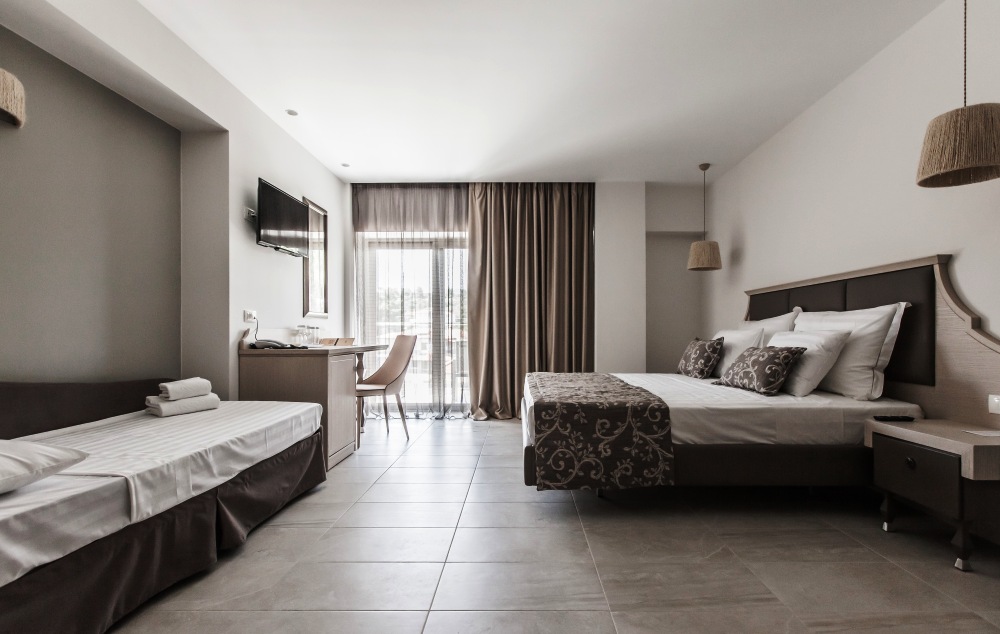 Superior Room Sea View- 24-27 m2, Udobna dvokrevetna soba sa balkonom i pogledom na Egejsko more ima bračni ili dva odvojena kreveta i sofu-transformer, pogodnu za 2-4 osobe.